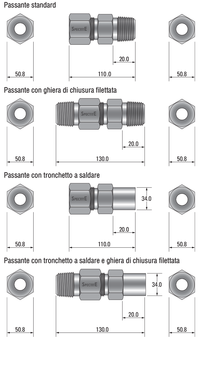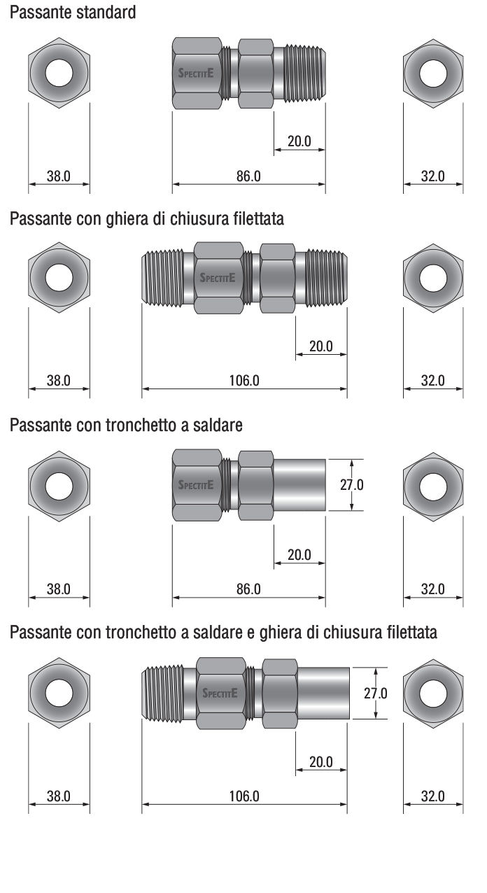 Il corpo del passante è disponibile in quattro misure, con attacco lato processo da 1/16", 1/8", 1/4", 1/2" e 3/4" Gas Conico (BSPT o DIN 2999 R), Cilindrico o NPT a scelta.
